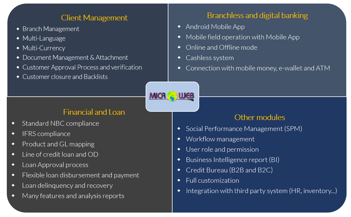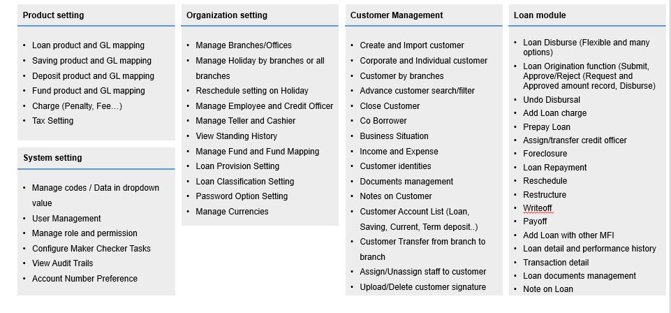 - Scalable Core Banking: Operator/Pawn > MFI/Leasing > Specialized Banking > Commercial Banking