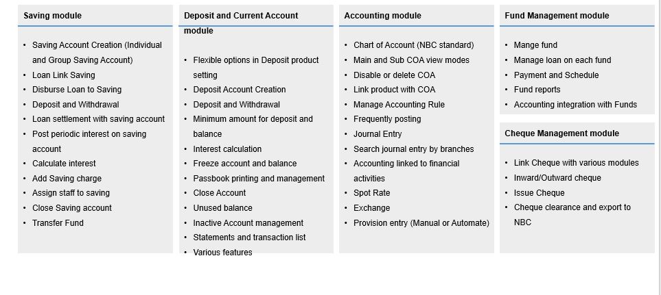 - Robust Core Banking System (More than 50 institutions, More than 10 Years and developed by experienced professionals)